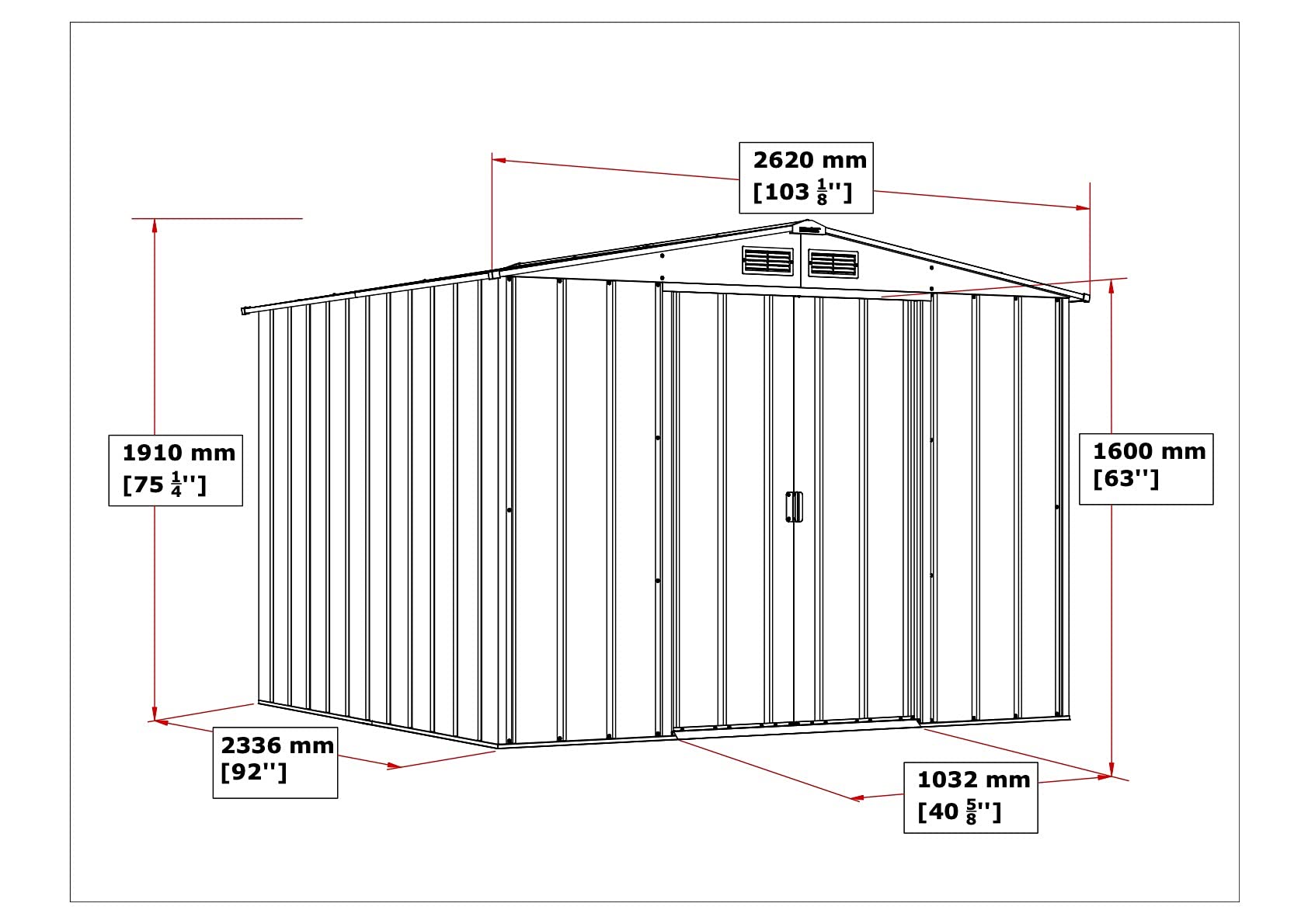 - Cet abri de jardin a la taille idéale pour garder vos outils de jardinage, vélos, barbecue, équipement d’exercice, accessoires de réparation automobile et autres effets personnels au sec et en sécurité; Dimensions extérieures (LxlxH): 262 x 242.2 x 191 cm