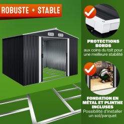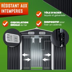 - CONTENU DE LA LIVRAISON : 1x Abri de jardin 8,4 m³ // Dimensions (LxlxH) : 257x205x177,5cm // 2 dispositifs avec 2 crochets supportant chacun max. 15 kg // Fondation incluse // Matériau : tôle d’acier galvanisé // Couleur : anthracite