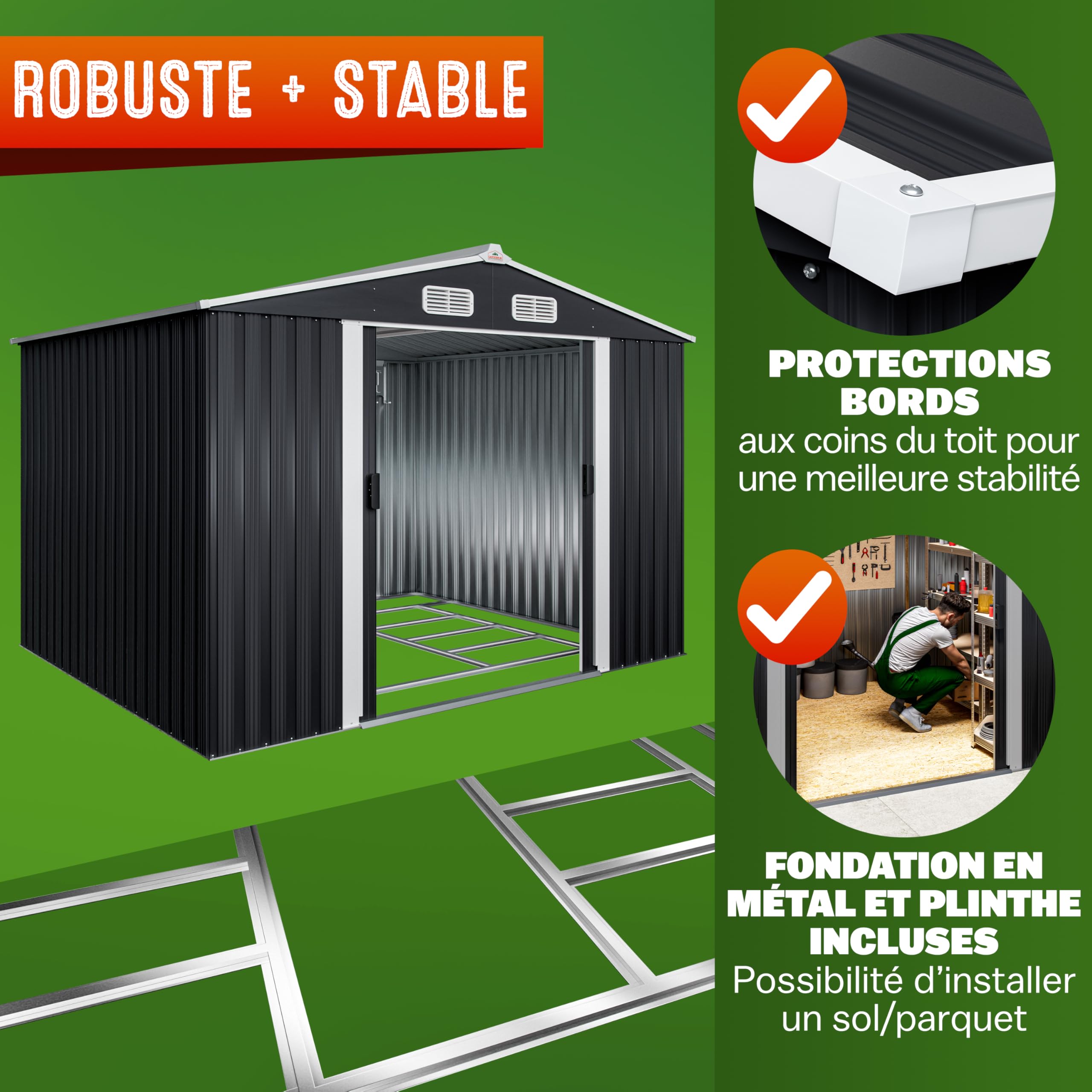 - STABLE : La fondation en métal incluse offre une bonne stabilité et la possibilité d’installer un sol supplémentaire. Les coins du toit métallique sont pourvus d’une protection de bords. Afin de sécuriser l’abri de jardin, la porte peut également être verrouillée avec un cadenas.