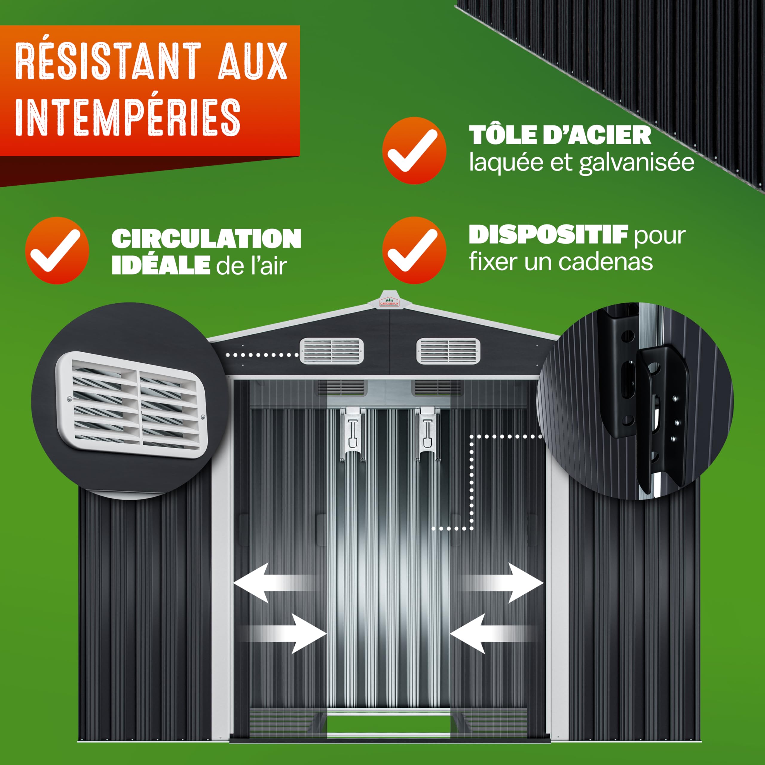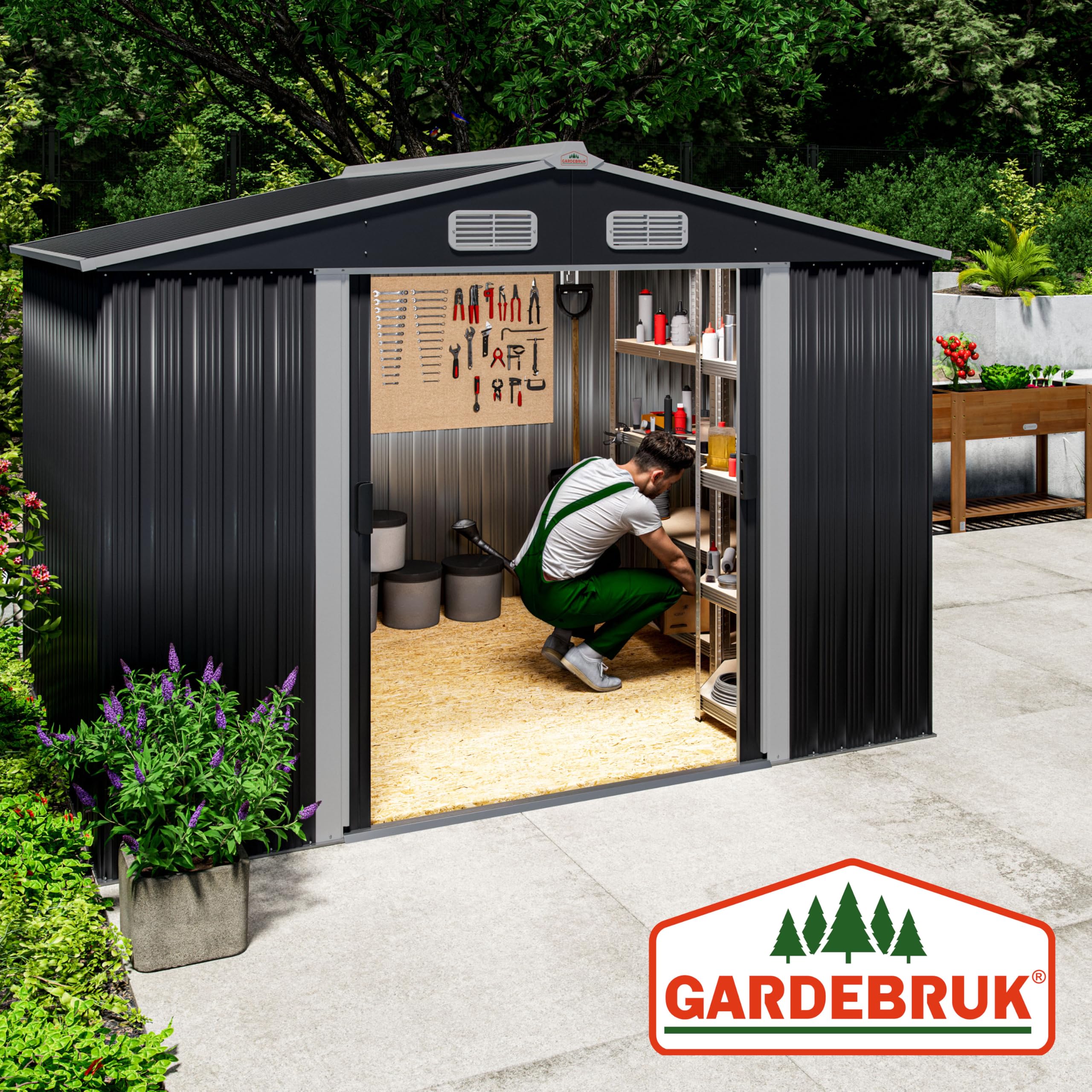 - ABRI DE JARDIN EN MÉTAL : Cet abri de jardin de haute qualité de Gardebruk est muni d’un toit à 2 pans et convient parfaitement pour le rangement de vos outils et équipements de jardin en un endroit sûr et sec. Grâce à sa surface généreuse, le cabanon de jardin vous offre suffisamment d’espace pour votre tondeuse à gazon, barbecue, meubles de jardin et autres ustensiles.
