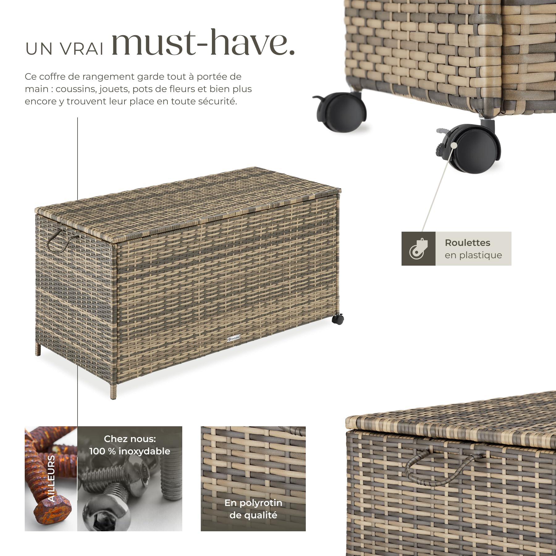 tectake® Coffre de jardin Exterieur, Coffre à Coussins 297 L en Aluminium Polyrotin 117 x 54 x 64 cm avec Roulettes, Couvercle Rabattable, Poignées pour Rangement des Outils de Jardin, Matelas, Jouets