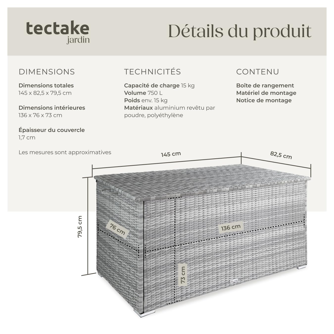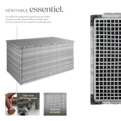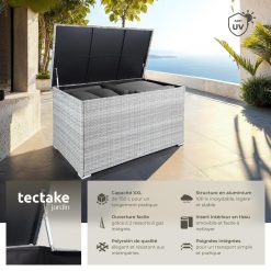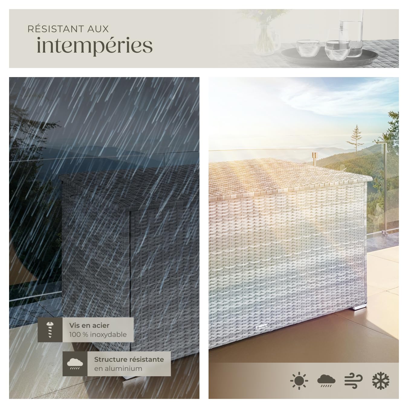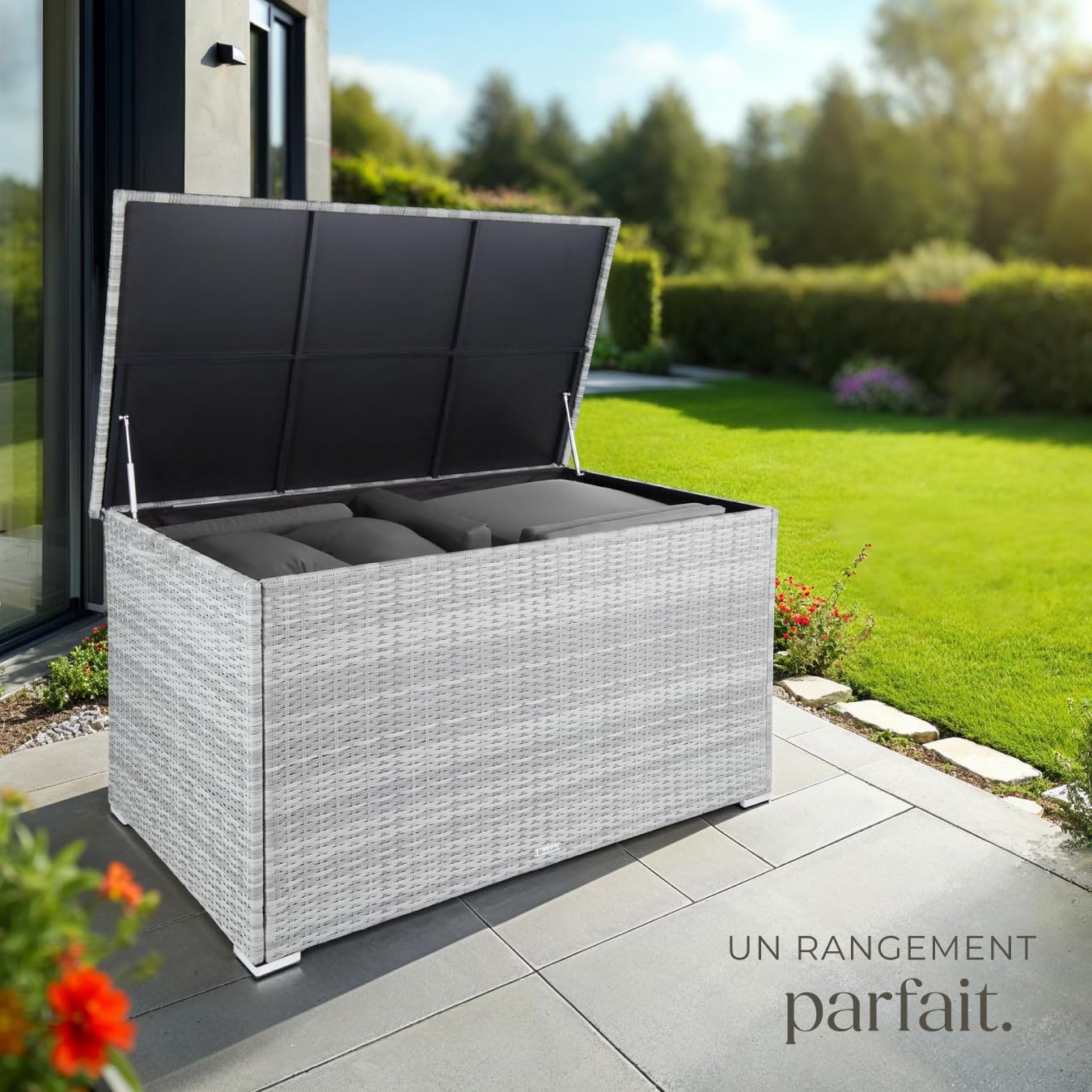 - UN ESPACE DE RANGEMENT XXL POUR TOUS VOS BESOINS : Avec ses 750 L de capacité, ce coffre de jardin extérieur ne se contente pas de stocker, il organise votre espace extérieur. Que ce soit pour des coussins de jardin, des outils ou des jouets, tout trouve sa place. Sa structure en résine tressée de haute qualité et résistante aux UV assure non seulement une esthétique raffinée mais également une facilité d’entretien. Dites adieu au désordre dans votre jardin ou sur votre terrasse extérieure !