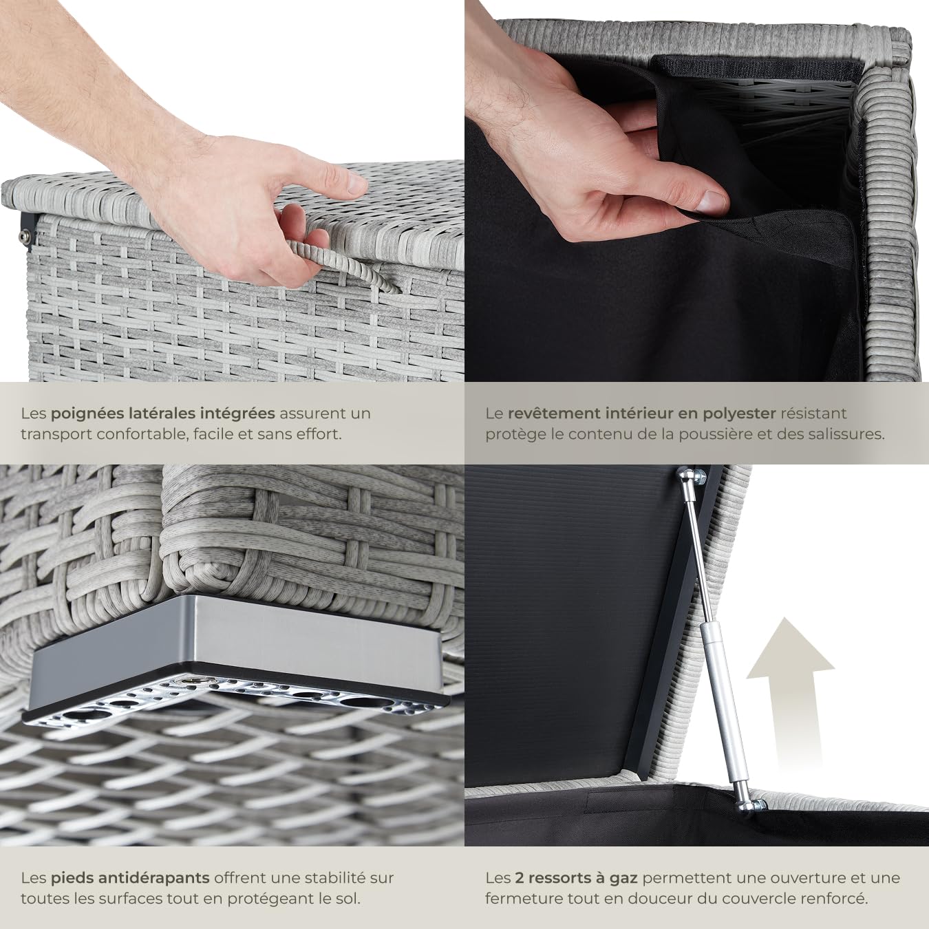 - CONCEPTION INGÉNIEUSE AVEC CONFORT D’UTILISATION : Ouvrez et fermez ce coffre de rangement extérieur sans effort grâce à son couvercle équipé de deux vérins à gaz. La maniabilité est renforcée par des poignées latérales robustes, facilitant le déplacement au sein de votre espace extérieur. Son revêtement intérieur amovible garantit une protection supplémentaire pour vos objets de valeur, rendant ce meuble de rangement aussi pratique qu’élégant.