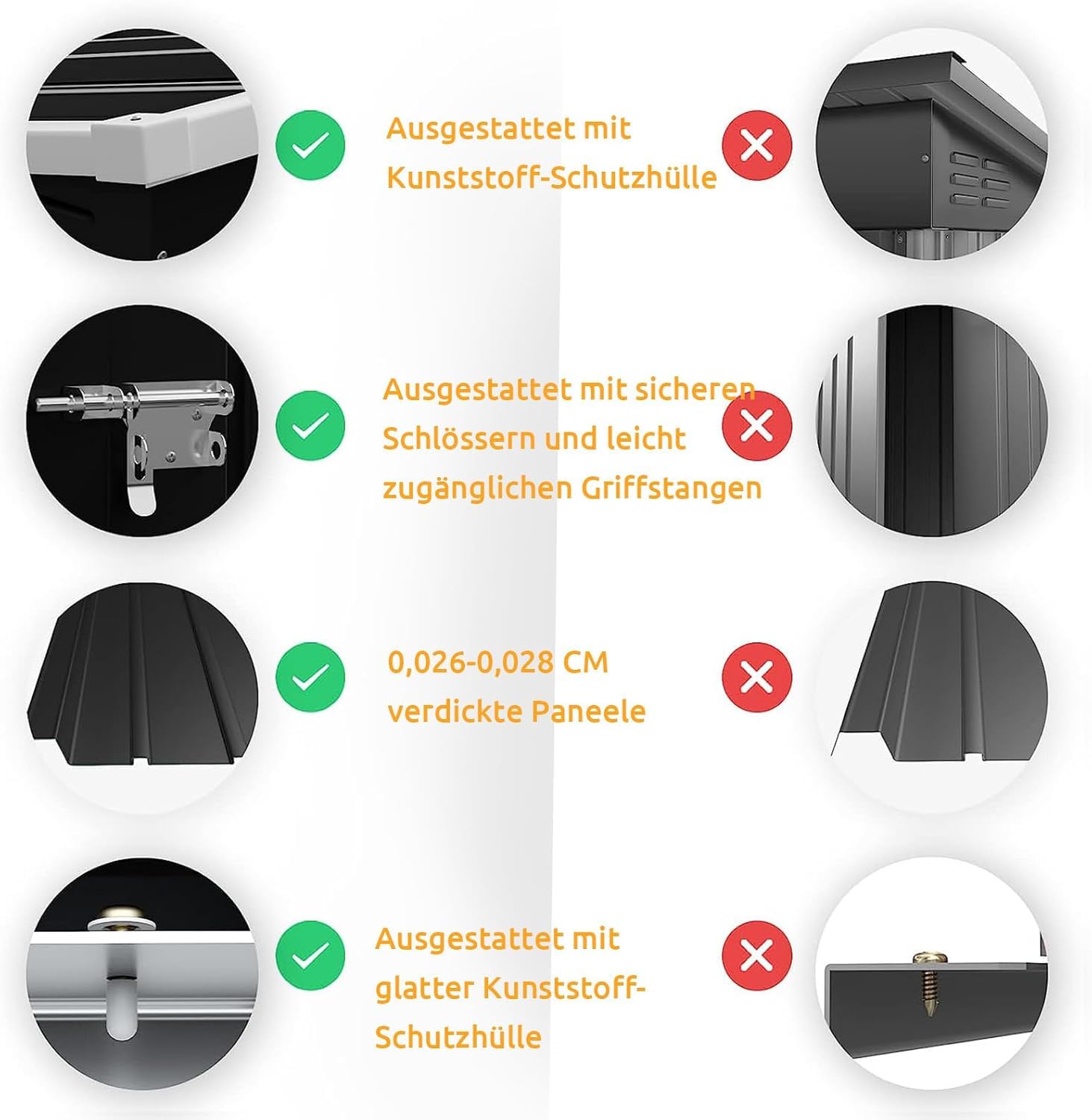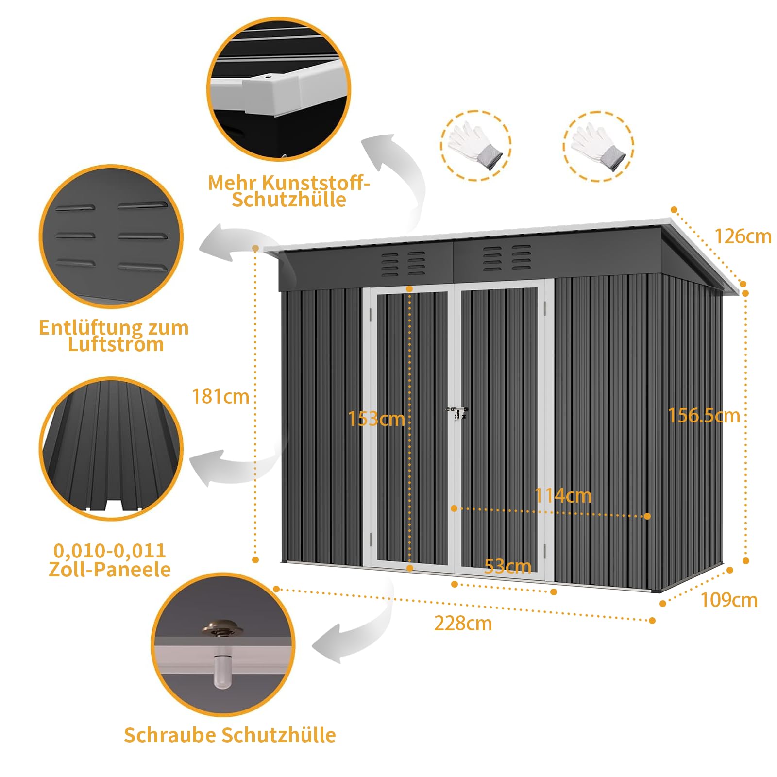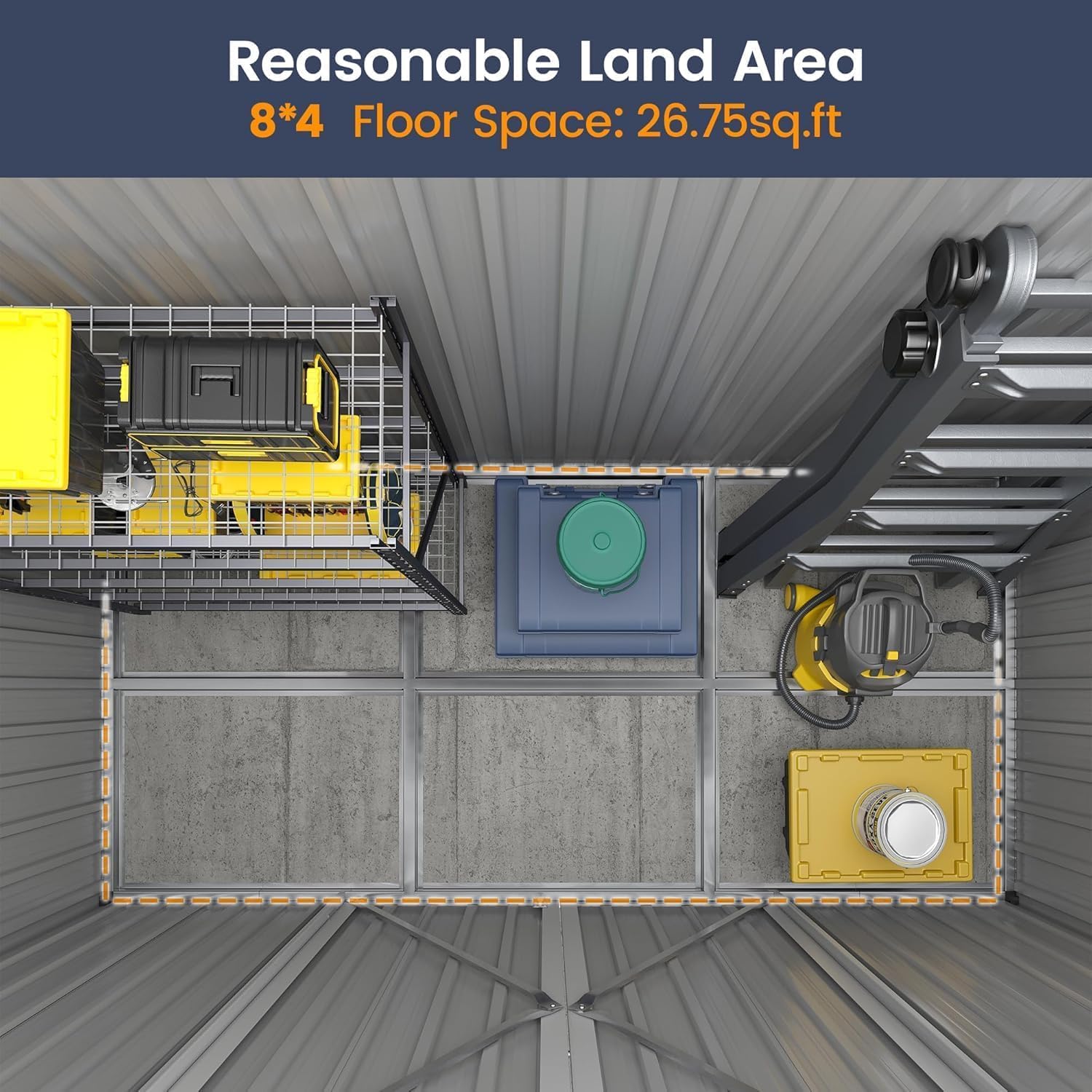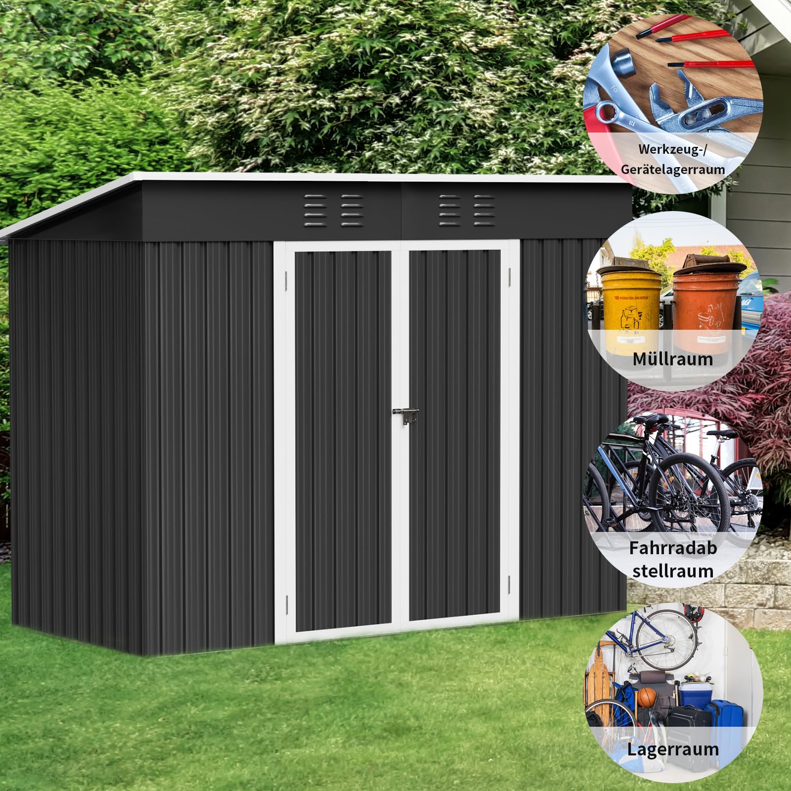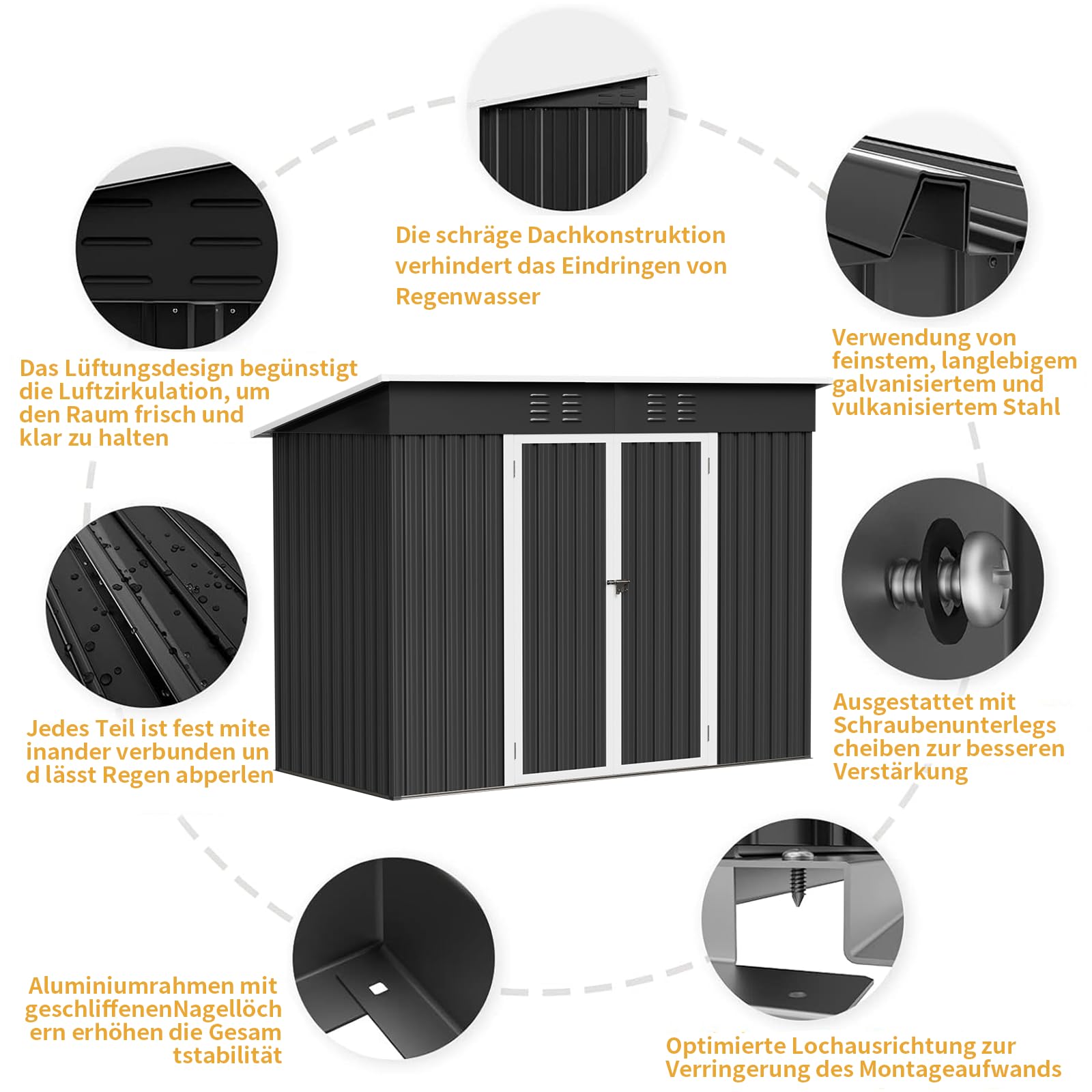 - 【Toit Incliné & Ventilation Intelligente】Le toit incliné de cette cabane de jardin évite l’accumulation d’eau et protège contre l’humidité. Les ouvertures discrètes améliorent la circulation d’air, empêchant la condensation et les mauvaises odeurs.
